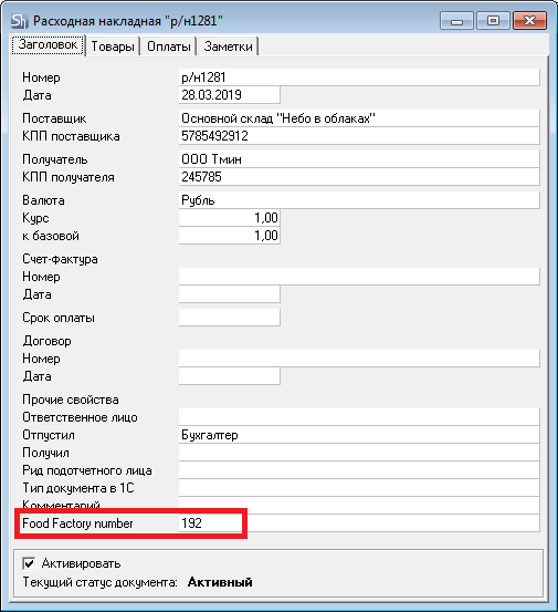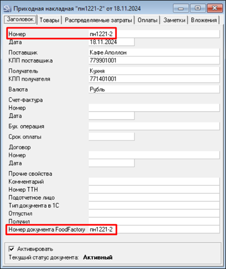 If the number was filled in manually when creating a receipt note or if the number was changed when editing a receipt note, then after the documents are transferred to r_k StoreHouse Pro, the number assigned in FoodFactory will be displayed on the "Title" tab in the "Number" field and in the corresponding field of the delivery note title's additional attribute.