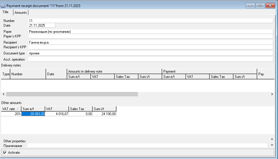 In the generated payment document for "service sales", the amounts will be split according to the VAT rates specified for the services in the request.
