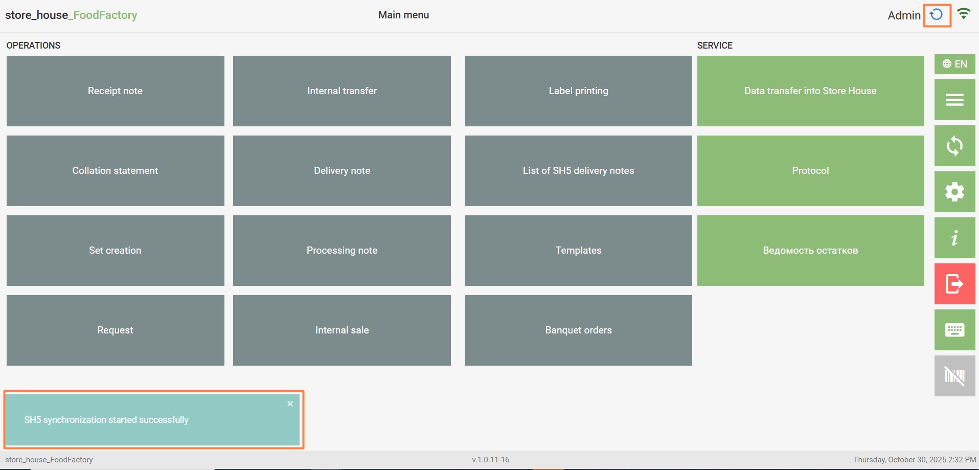 To start synchronization with r_k StoreHouse Pro without waiting for the configured synchronization frequency time, press the button in the main menu. After this, a message about the start of synchronization will appear in the lower left corner of the window, and the synchronization process with SH5 will be indicated by the icon to the right of the user's login.