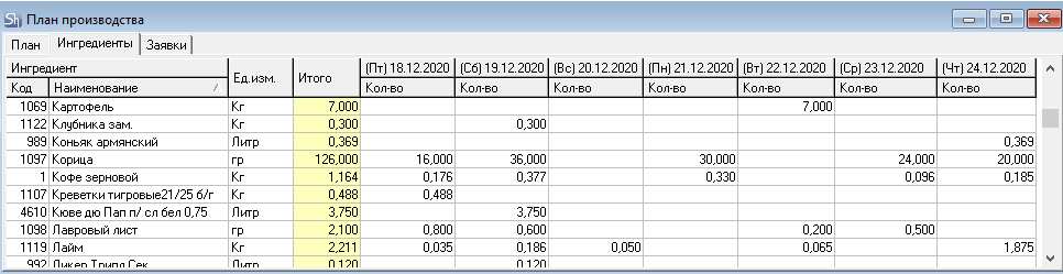 The "Ingredients" tab of the production plan displays the theoretical expenditure of ingredients by date based on the saved production plan.