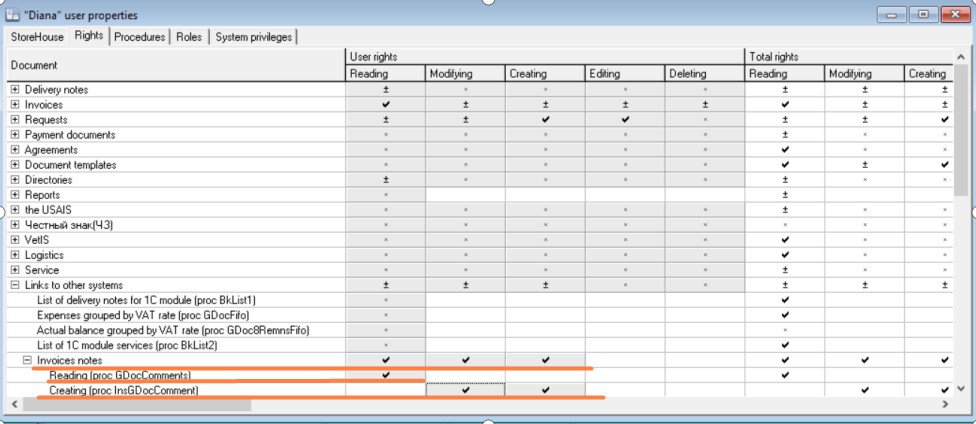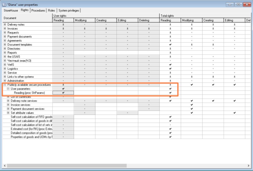 - Personal user permissions from the Reading, Modifying, Creating, Editing, Deleting columns.