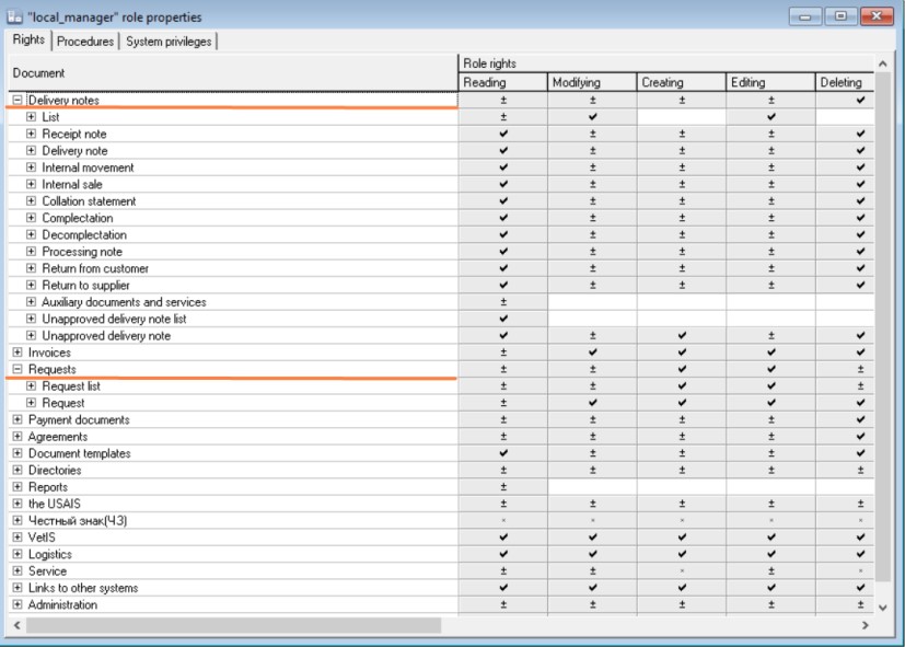To work with documents in the FoodFactory application, the user must be granted permissions for actions with documents in the Delivery notes and Requests groups.