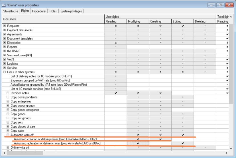 Also, in the Links to other systems group, in the Automatic Write-off subgroup, you can define user permissions for automatic creation and activation of delivery notes for requests during data transfer to r_k StoreHouse Pro. The flags for creating and activating delivery notes for requests must be set in the document settings.