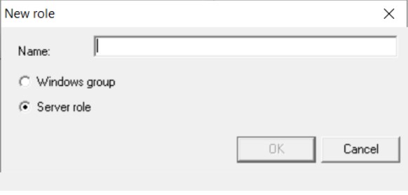 In the "New Role" window that opens, enter the name of the role being created in the "Name:" field, set the Server Role radio button, and press the "OK" button.