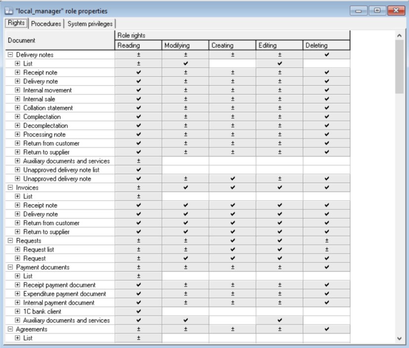 The "Role Properties" window will open, where you can define permissions on the "Rights" tab by checking the boxes in the appropriate fields.