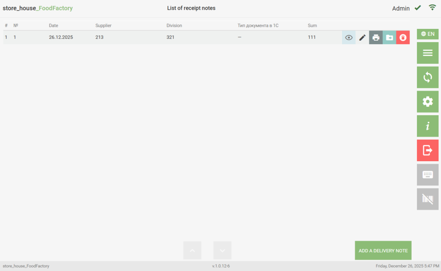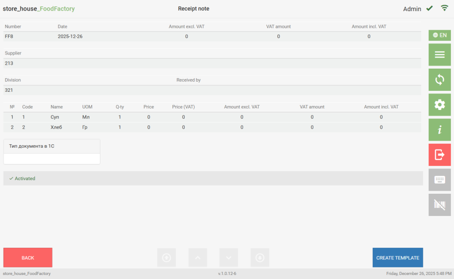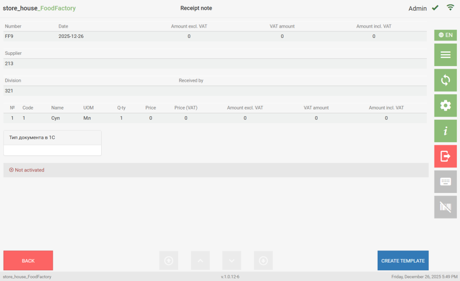 Documents that have not yet been uploaded to r_k StoreHouse Pro are available for viewing (displayed in the list). To view a saved delivery note or request, in the corresponding document list, click the button for the desired document. The document contents will then be displayed on the screen. In the saved document view window, there is an option to create a template from this document using the "Create Template" button.