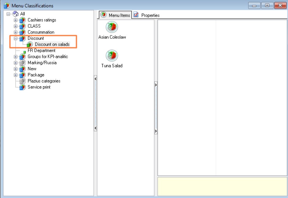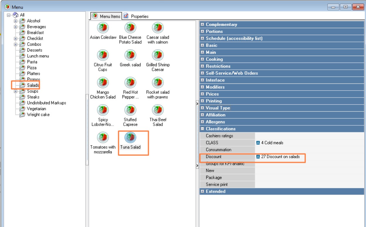 In the directory of Menu go to properties of menu items "Asian Coleslaw" and "Tuna Salad". Under Classifications Properties select the appropriate category from the created group Discount – "Discount on Salads".