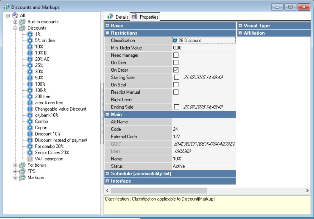 In the Restrictions section of the created discount's properties allow its application On Order and specify the classification of menu items you have created.
