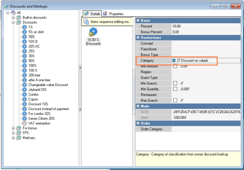 - Example: A 10% discount has been set on the category of dishes called "Salads". The order includes three menu items: "Tuna Salad" (price 150 rubles), "Tuna Salad" (price 200 rubles), "Ice Cream" (70 rubles). The discount will apply to the dishes "Tuna Salad", "Tuna Salad". The total discount amount will be 35 rubles=15rub+20rub.