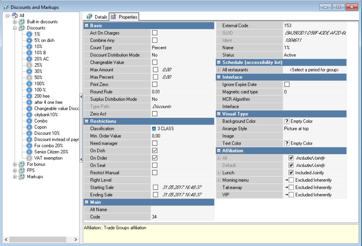 The first stage of configuring discounts is complete. Now it is necessary to set its Usage so that the discount functions at the cash register. For more information on this, please refer to the article Directory Usage of Discounts and Markups.
