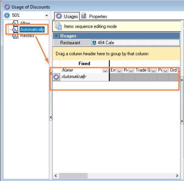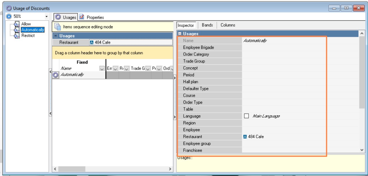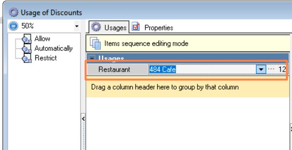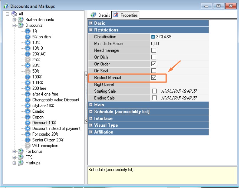 - If the setting Restrict Manual is active for a discount or markup, it cannot be manually assigned at the cash register by any employees regardless of usage rules.