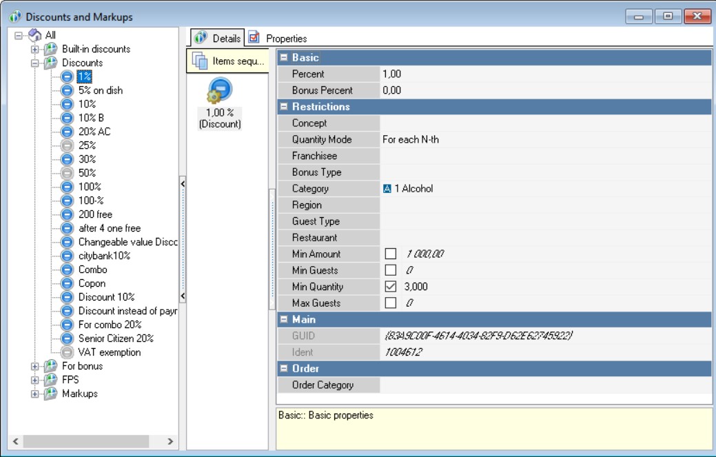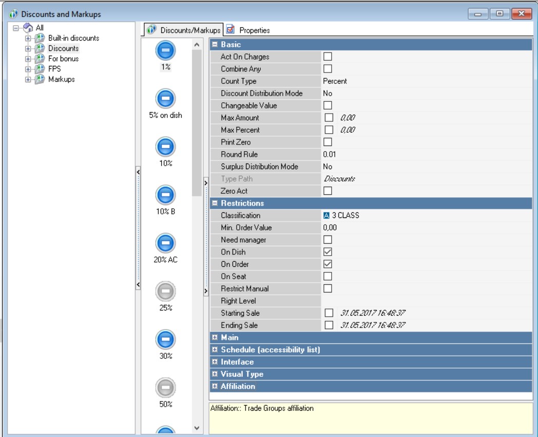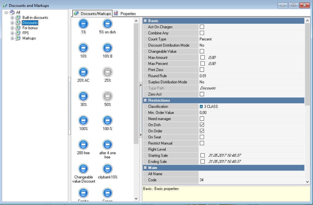 Percent (Amount) – here you enter either the discount percentage from the dish cost (if it's a percentage discount), or the fixed sum (if it's a fixed-amount discount).
