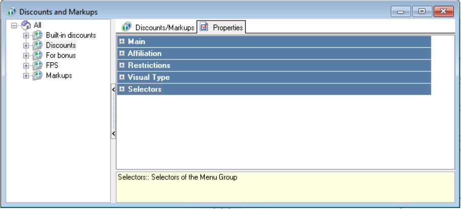 If a type of discount (markup) is selected in the tree, its properties are displayed on this page in the Inspector window: