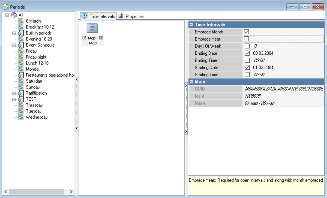 Next, set up a special period running from March 1st to March 8th and name it something like 'March 8'. In its properties, specify only date and month since the period isn't limited by year.