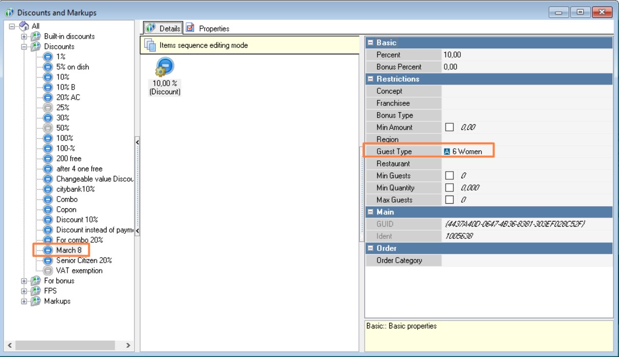 This article describes how to create a discount specifically for women valid from March 1st through March 8th. During this festive week celebrating International Women's Day (from March 1st to March 8th), a 10% discount will be offered exclusively to female guests. The discount should automatically apply at cash register. This promotion is planned to repeat annually.
