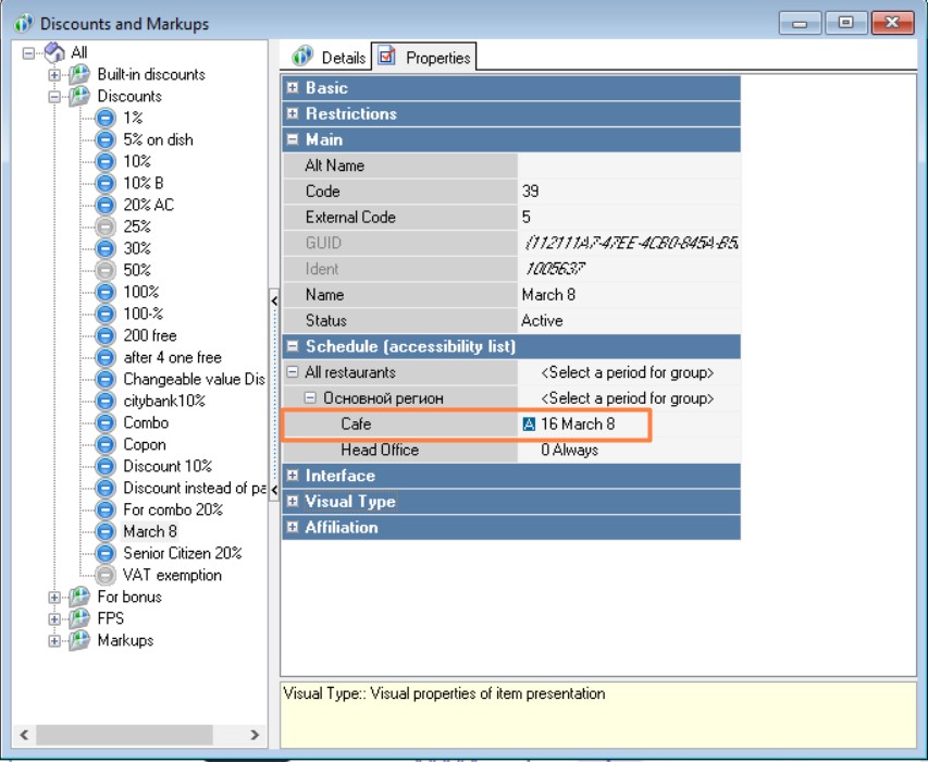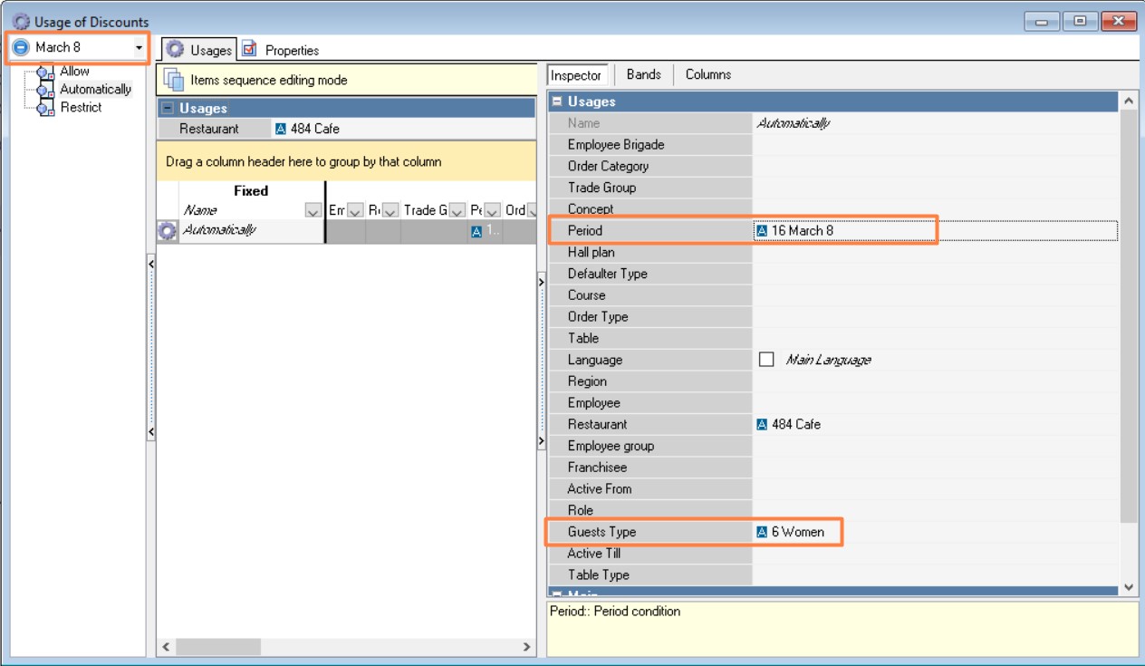 On the Properties tab of your selected discount, define the schedule applicable to the Restaurant. Select the previously created period named 'March 8'.